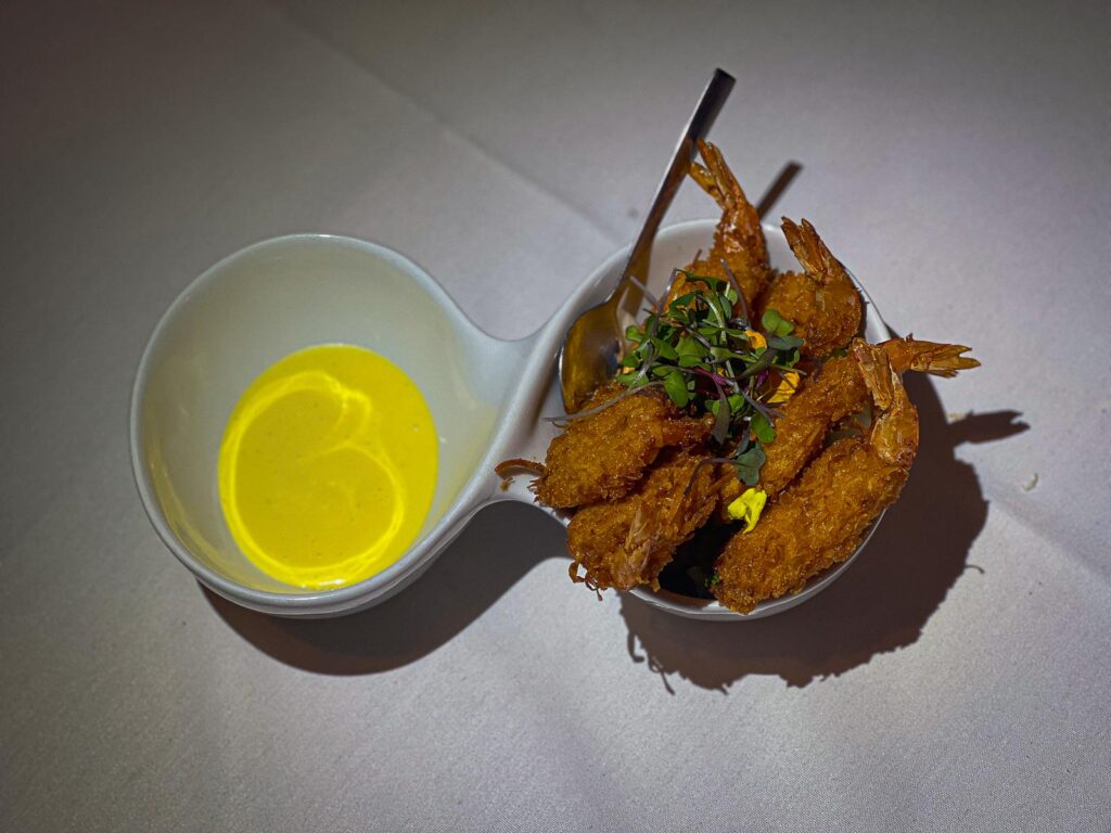 A whole Tilapia fish deep fried to a crispy golden brown with a chili paste coconut milk sauce, then topped with crispy basil.